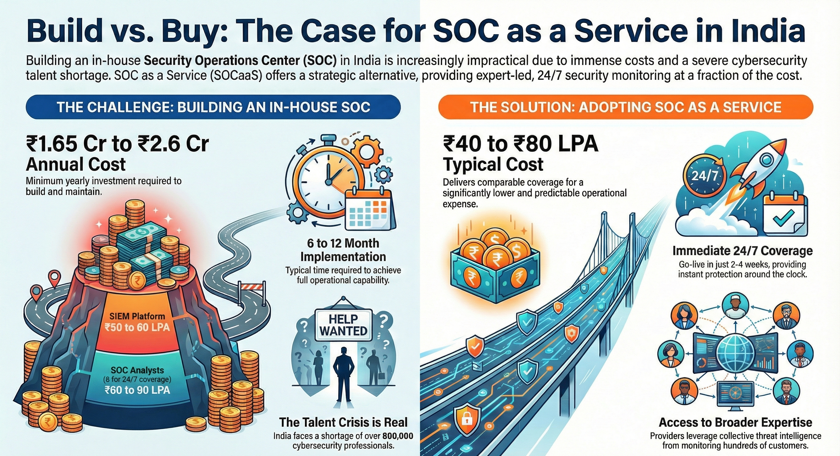 Building an in house Security Operations Center (SOC) is expensive, time consuming, and increasingly impractical for most organizations. The talent shortage alone, with 800,000+ unfilled cybersecurity positions in India, makes 24/7 coverage a significant challenge.